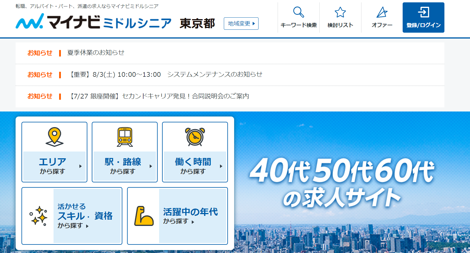マイナビミドルシニアは、40代・50代・60代の方々に特化した転職サイトです。正社員だけでなく、派遣社員やパート、アルバイトの求人も豊富に取り揃えており、様々な雇用形態に対応しています。