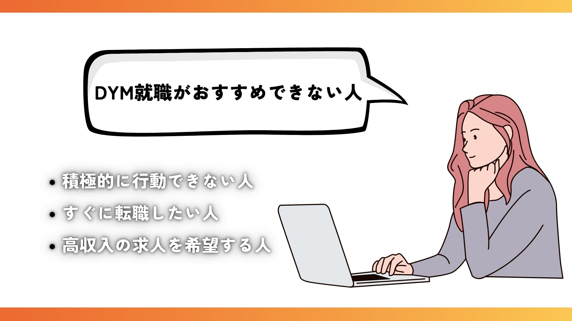 DYM就職は、じっくりと時間をかけて転職活動を行うスタイルです。そのため、すぐに転職先を決めたい、一刻も早く現職を辞めたいと考えている人には不向きです。内定獲得までにはある程度の期間が必要となるため、時間に余裕を持って転職活動に取り組める人がDYM就職のサービスと相性が良いでしょう。