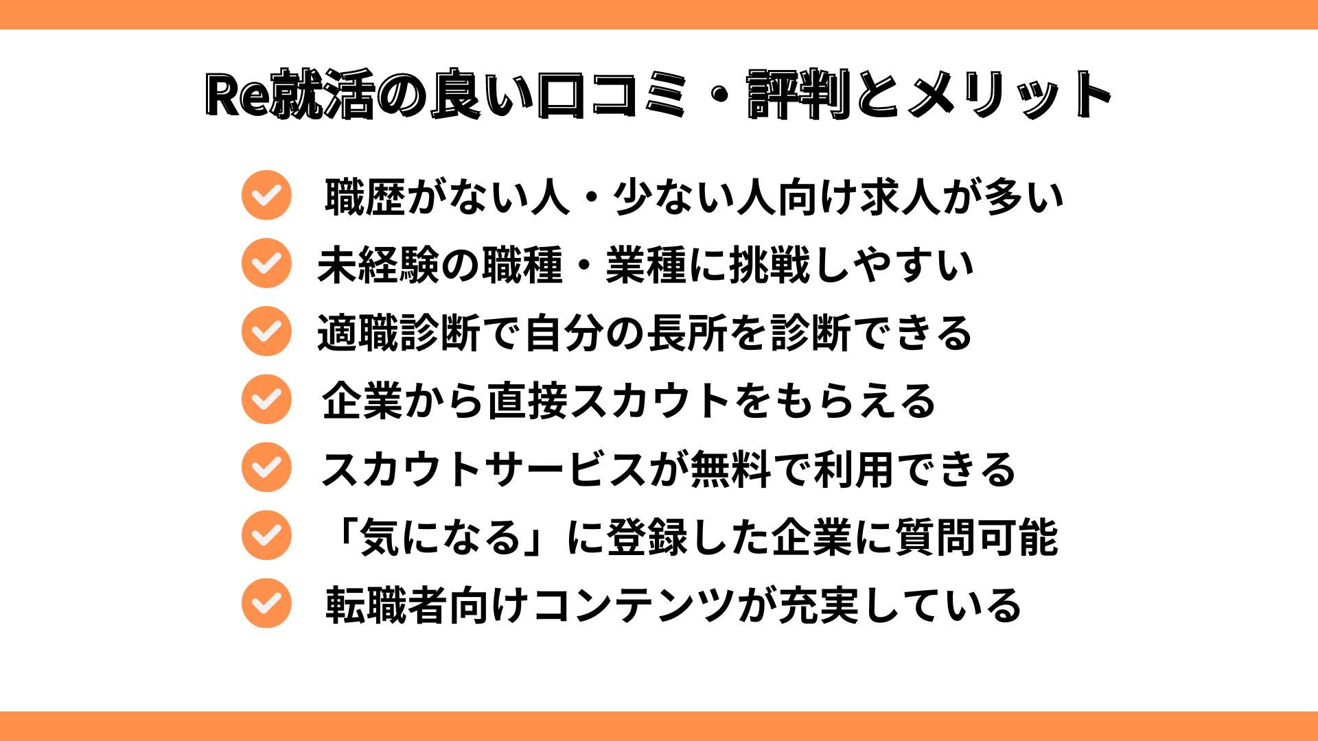 デメリットの次は、Re就活で転職活動をして成果を上げた求職者から寄せられた良い口コミ・評判から確認できるメリットを紹介します。