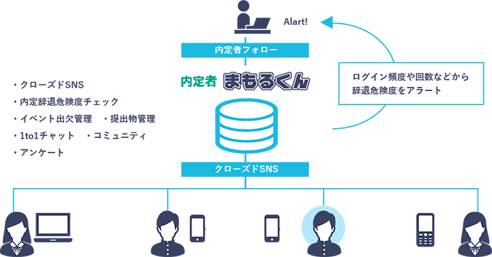 内定者フォロー ※オプション機能です 内定辞退率を0%に!内定者フォロー専用システム! 採用管理ツールと連携した一気通貫の内定者フォローシステムで内定者をしっかり入社までつなげます。 マイページのログイン頻度やイベントの出欠、提出物の提出状況などから、内定辞退のリスクが高い内定者をリストアップ。辞退可能性を可視化すると同時に、アラート機能でそれらの内定者に対してすばやく対応できます。さらに、内定者同士や社員とのコミュニケーションを活性化させるSNS機能を搭載し、一般のSNSでは実現できない「内定者コミュニティそのものの管理」を行いつつ、入社までモチベーションを高めることができます。 研修などのイベントや提出物集計も一括で把握・管理が可能です。 内定者どうしのコミュニケーションや事務手続き等、全ての情報を網羅するマイページ。 辞退の可能性を可視化 内定者コミュニティへの積極性から判断し、辞退する可能性を可視化します。可能性のある学生をアラート表示し、どの学生を注力してフォローすればいいのかひと目でわかります。 アラート機能 提出物やアンケートの未提出者がダッシュボードに記載されます。催促などの必要有無がひと目でわかります。 提出物管理 誰がどの提出物を出していないかをグラフで可視化します。過去のメールを確認したり、エクセルで管理するなどの手間を減らすことができます。 アンケート回収 内定者へのアンケートを回収することができます。なぜ当社を選んだのか?他社の選考で魅力的な選考内容は?など、次年度の採用戦略に役立てることができます。 出欠管理 親睦会や社員対談などのイベントの出欠を確認することができます。どのイベントに何人参加するのかひと目でわかります。 コミュニティ形成 内定者と社員とのコミュニティを形成し、課題提出や情報のやり取りを管理することができます。 スケジュール管理 イベントのスケジュールや提出物の期限がカレンダーで表示され、漏れや抜けを減らすことができます。